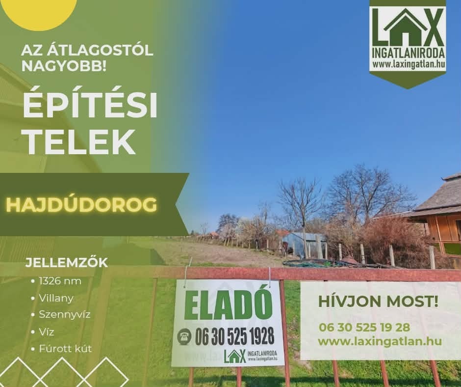 Hajdúdorog békés, nyugodt, családok által közkedvelt, jól megközelíthető részén található ez az 1326 nm-es víz, villany és szennyvíz közművekkel, valamint ásott kúttal ellátott építési telek.