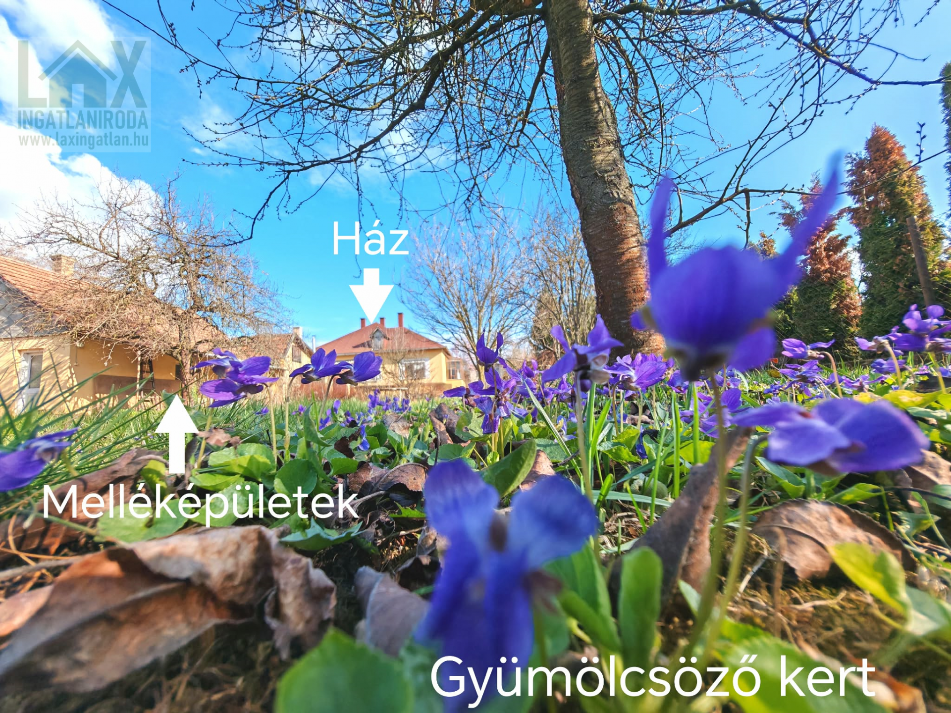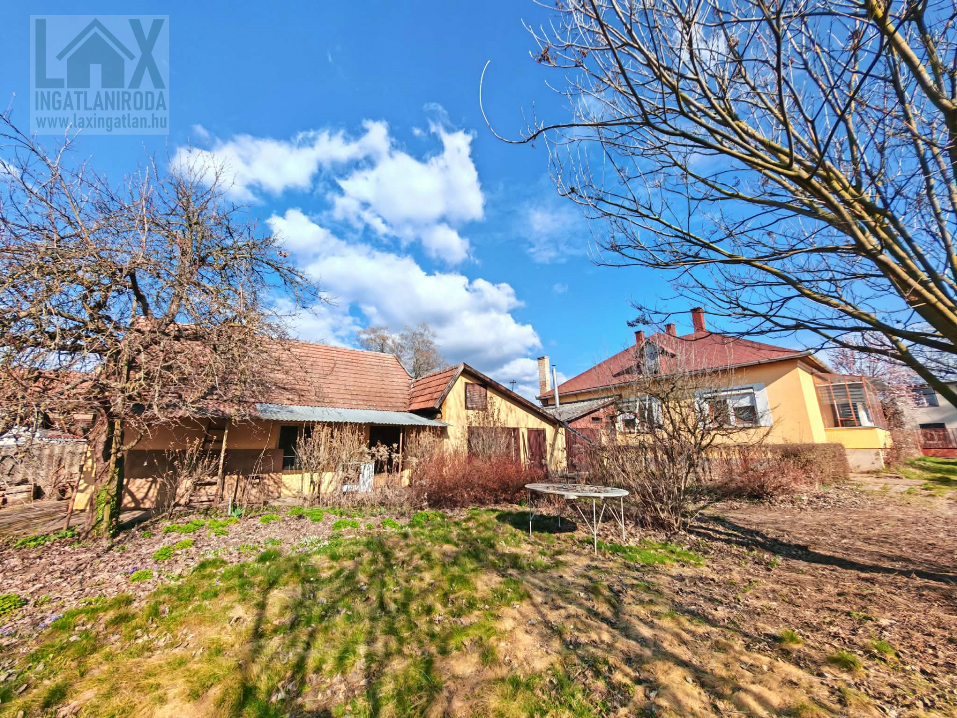 1079 nm-es víz, villany és gáz közművekkel felszerelt, gyümölcsfákban, dísznövényekben bővelkedő stabilan körbekerített udvar veszi körül a lakóépületet, ahol egy stabil állapotú melléképületet is talál többféle funkciójú tároló helyiségekkel és garázzsal ellátva. Ezek villannyal ellátottak. Emellett egy hagyományosan zöldség- és gyümölcstárolásra használt verem is helyet kapott a kertben.